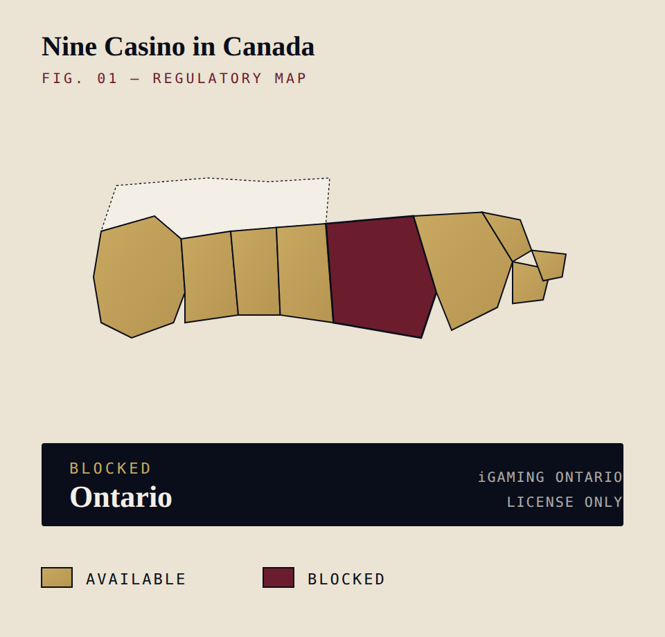 Map of Canada showing Nine Casino availability — Ontario blocked, other provinces available. Fig. 01 — Ontario is the lone province with its own regulator (AGCO / iGaming Ontario). Nine Casino holds no iGO licence.