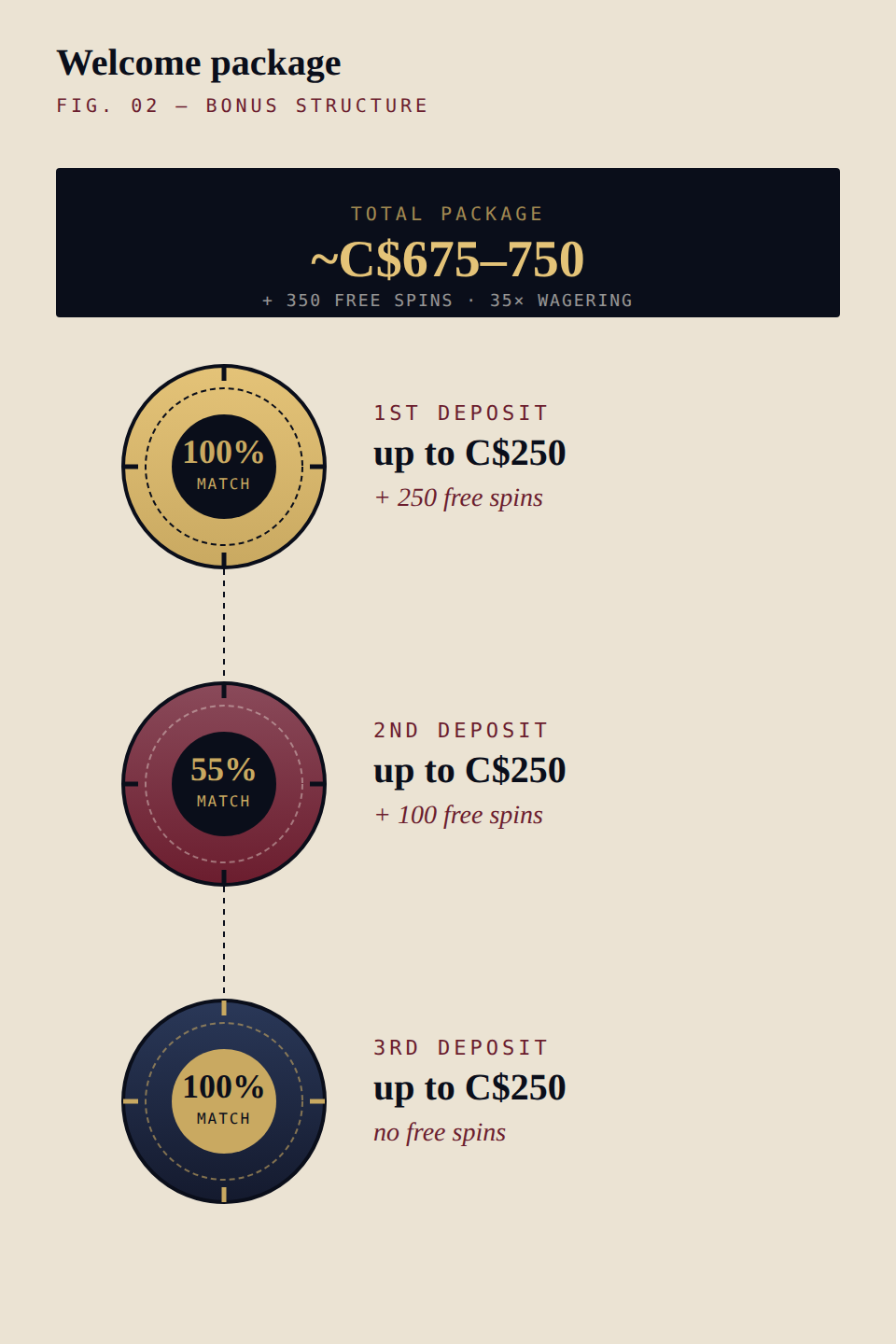 Three-step welcome package FIG. 02 — BONUS STRUCTURE 100% MATCH 1ST DEPOSIT up to C$250 + 250 free spins 55% MATCH 2ND DEPOSIT up to C$250 + 100 free spins 100% MATCH 3RD DEPOSIT up to C$250 no free spins TOTAL PACKAGE ~C$675–750 + 350 FREE SPINS · 35× WAGERING