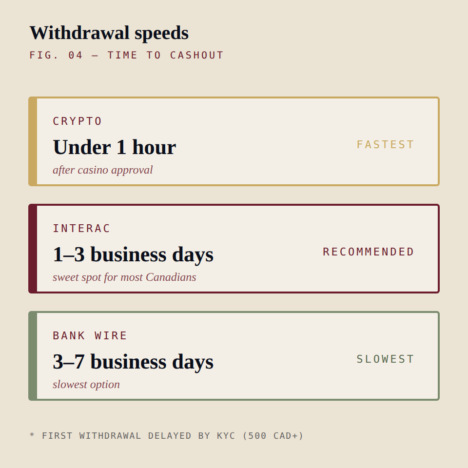 Crypto wins on speed. Interac is the sweet spot for most Canadians. First withdrawals always take longer due to KYC.